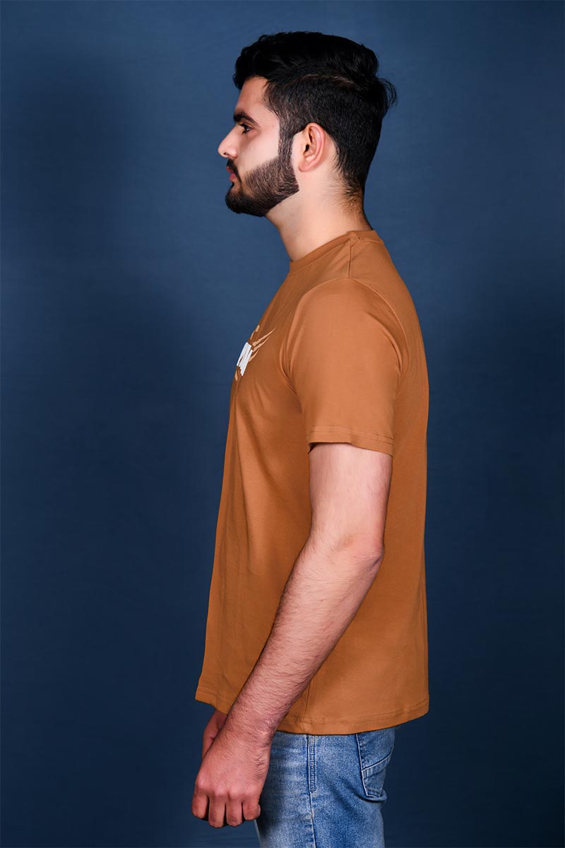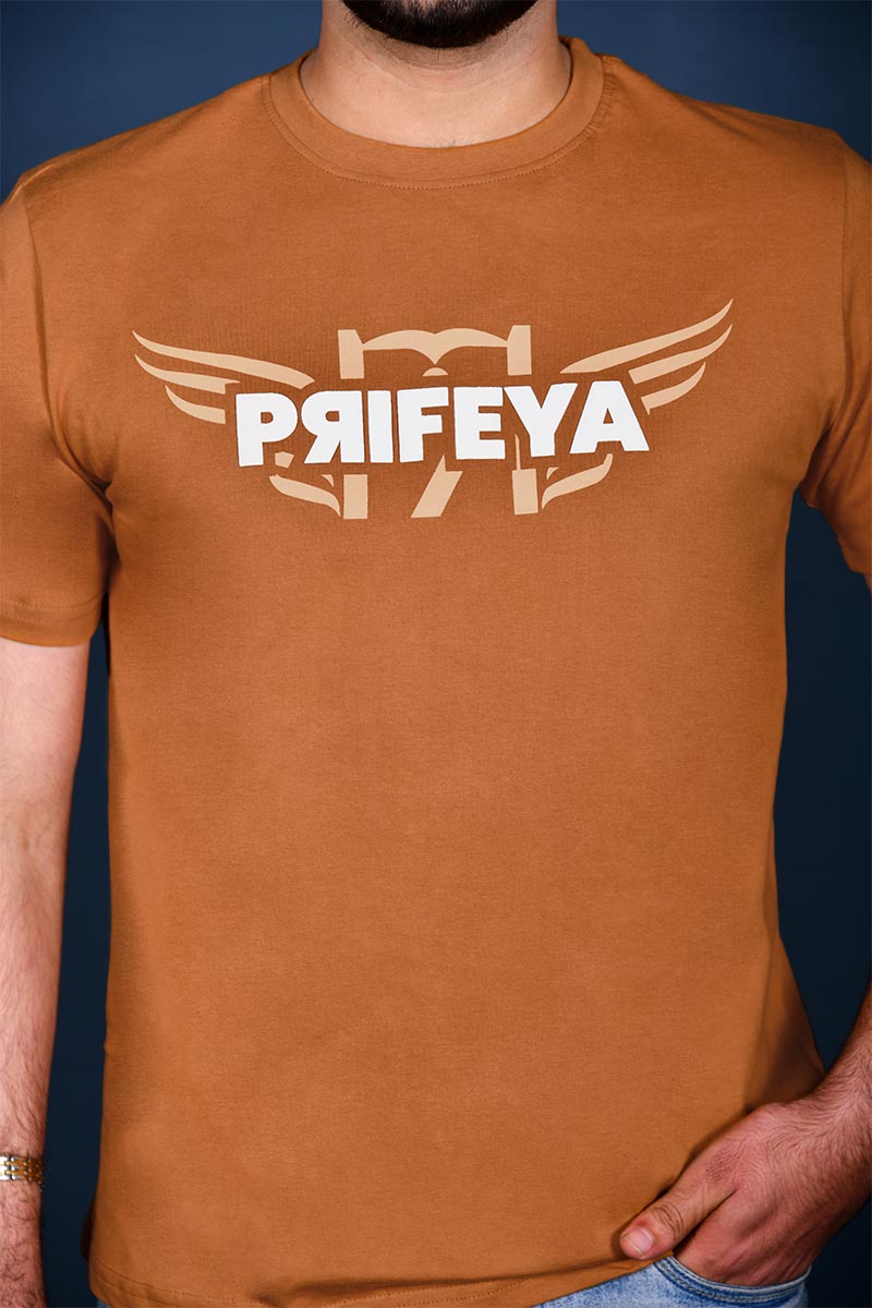 Prifeya Print Men Brown Crew Neck Brand Print T-Shirt. This Round Neck shirt is made of cotton. Mix that snugs your body and gives you an incredible measured and molded shirt. It is an optimal wear for all seasons and all events. We all adoration colors that go with the character we convey. We trust something similar. Style the manner in which you like, these tones will spice up the clothing.