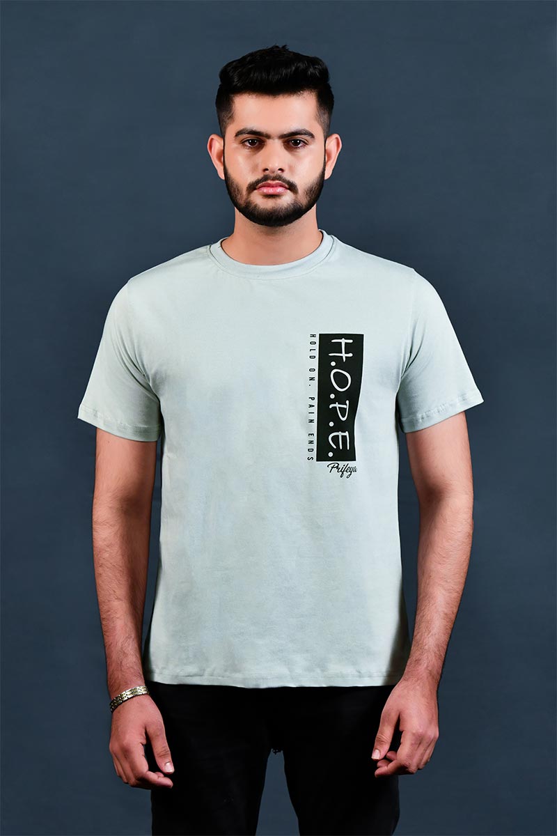 Prifeya Print Men Green Crew Neck Hope Print T-Shirt. This Round Neck shirt is made of cotton. Mix that snugs your body and gives you an incredible measured and molded shirt. It is an optimal wear for all seasons and all events. We all adoration colors that go with the character we convey. We trust something similar. Style the manner in which you like, these tones will spice up the clothing.