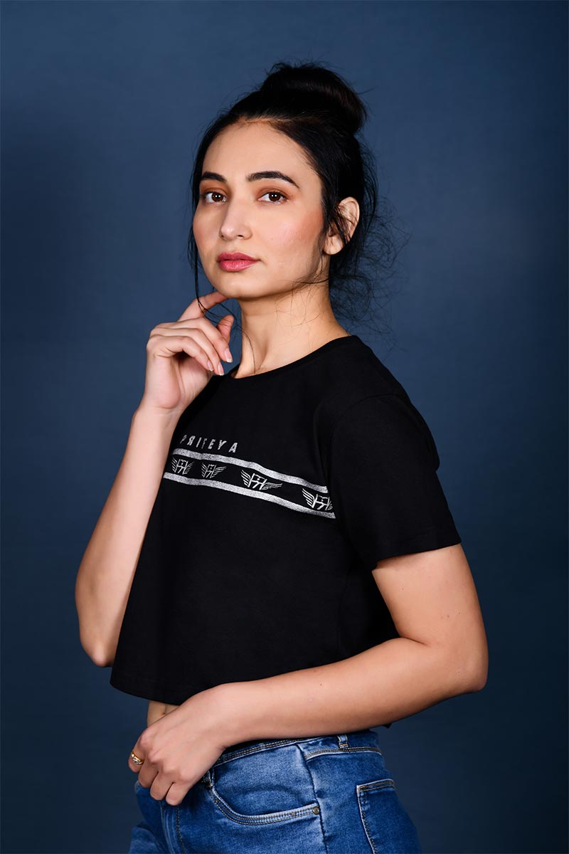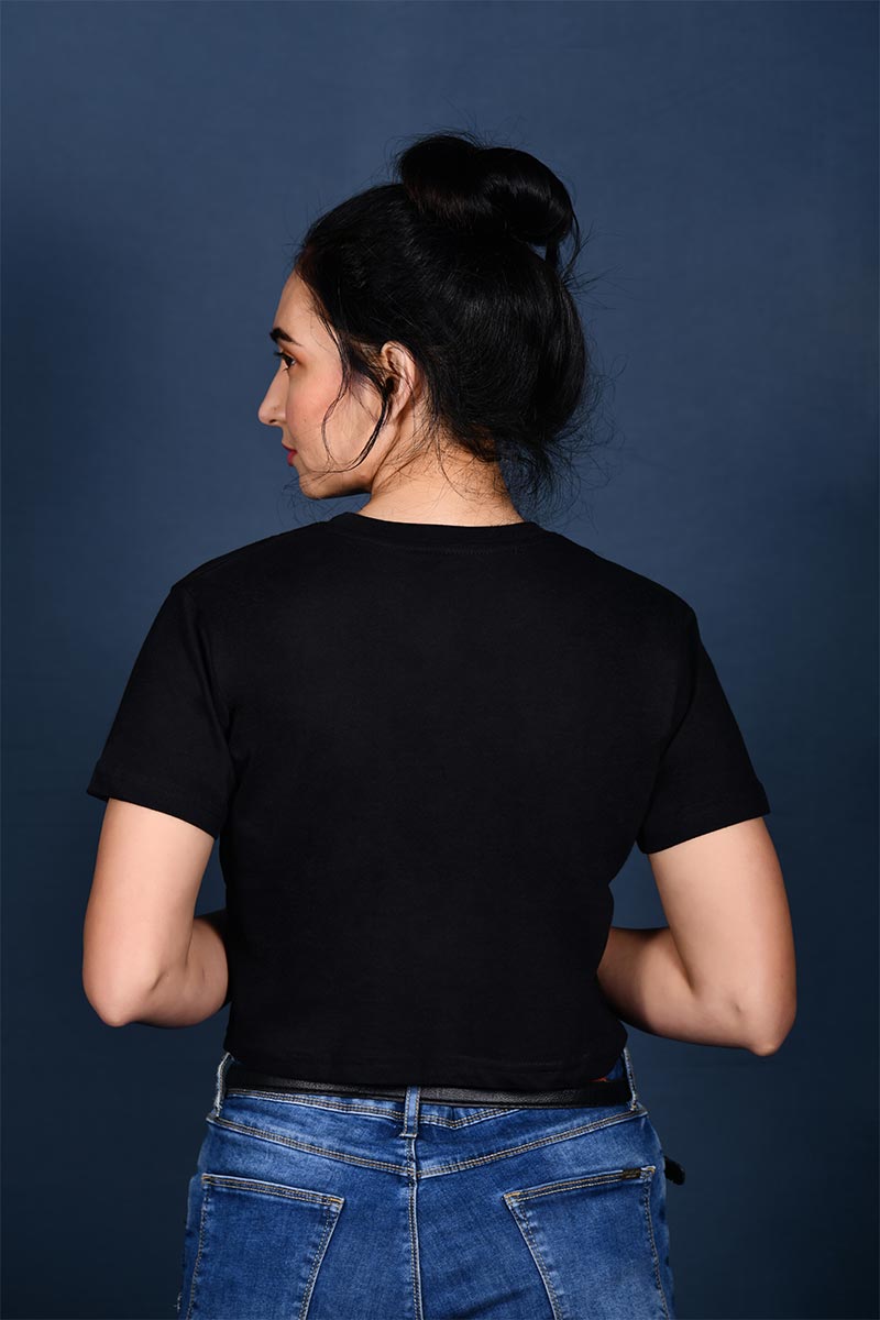 Women Black Brand Print Crop Top T-Shirt get a trend-led lift with our collection of cropped t-shirts for women. The perfect complement to high-wasted trousers and jeans, cropped t-shirts are also a comfortable choice to wear under dresses and dungarees. Our collection, made from the softest materials, arrives in black and other colours to suit individual palettes. Fashionable and functional, the cropped t-shirt has been elevated to a basic style.