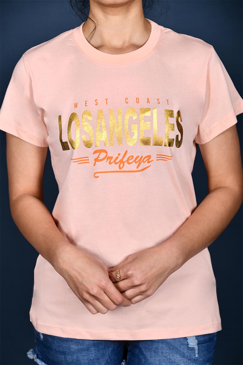 Women Peach Crew Neck Losangeles Print T-Shirt